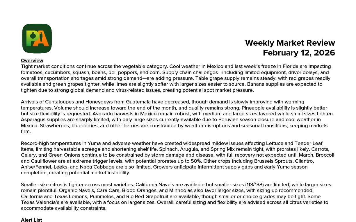 Alerts & What’s Trending Produce Lettuce prices continued climbing, with iceberg nearing historically rare levels above $50/carton. Tomato markets ...