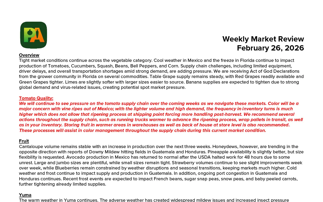 We expect to see very short crops, escalated pricing, and potential for pro-rates continue through March. Ongoing rain and cool weather continue to delay the crop. Until we see some return to warm weather and less rainfall, a crop recovery will not materialize. Crops out of Mexico are slowly improving, and we are seeing a downward trend on price as the volume increases. Unfortunately, with the imbalance on the East Coast due to less acreage planted and weather-related pressure, markets remain at record highs. We will see this continue until Florida can produce volume consistently. -